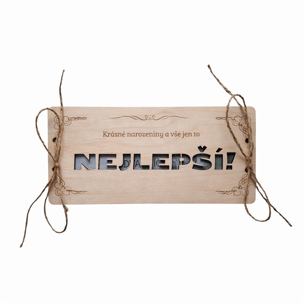 Elegantní dřevěné narozeninové přání na peníze s vyřezaným slovem NEJLEPŠÍ.