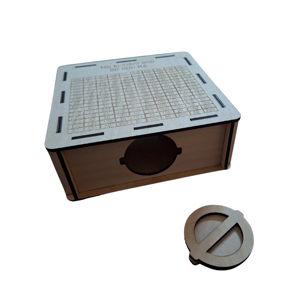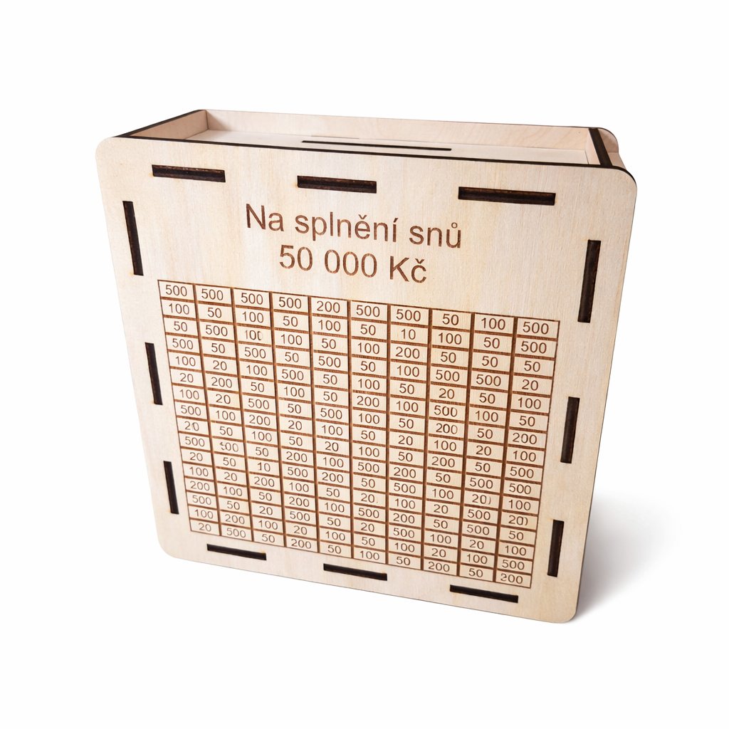 Uvnitř jsou přehledně rozpočítané pole s různými částkami, které si postupně odškrtáváš. Až doškrtáš poslední políčko, budeš mít v pokladničce rovných 50 000 Kč – a parádní pocit k tomu.
