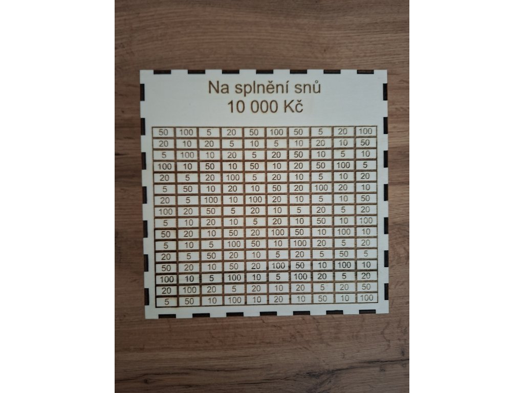 Uvnitř jsou přehledně rozpočítané pole s různými částkami, které si postupně odškrtáváš. Až doškrtáš poslední políčko, budeš mít v pokladničce rovných 10 000 Kč – a parádní pocit k tomu.