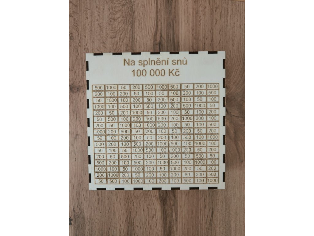 Uvnitř jsou přehledně rozpočítané pole s různými částkami, které si postupně odškrtáváš. Až doškrtáš poslední políčko, budeš mít v pokladničce rovných 100 000 Kč – a parádní pocit k tomu.