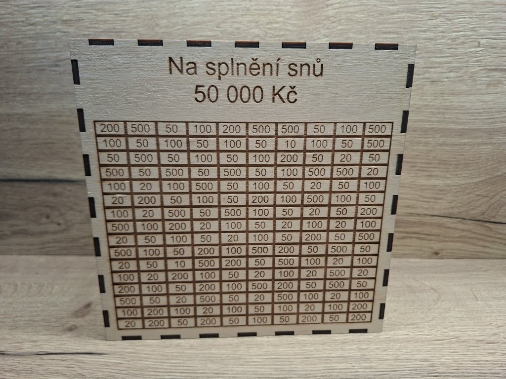 Uvnitř jsou přehledně rozpočítané pole s různými částkami, které si postupně odškrtáváš. Až doškrtáš poslední políčko, budeš mít v pokladničce rovných 50 000 Kč – a parádní pocit k tomu.